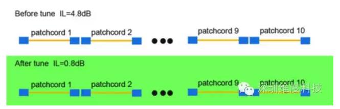 實(shí)驗(yàn)時(shí)沒有經(jīng)過調(diào)芯的10條光纖連接器串聯(lián)的接入損耗IL=4.8dB,每個(gè)光纖連接器經(jīng)過調(diào)芯后再串聯(lián)的接入損耗IL=0.8dB
